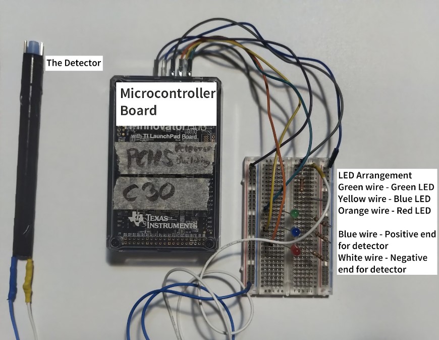 “Detector Building,” an event in the high school division of Science Olympiad, involves creating a detector with various parts, including a microcontroller and a breadboard. During this year, it was a salinity detector, which involves creating a device with two electrodes that then measures the conductivity of the water between the two electrodes. The resulting output voltage is then sent back to a microcontroller board, which converts this voltage, using a preprogrammed algorithm, into a salinity level (ppm) and turns on an LED corresponding to a range given on the day of competition.
